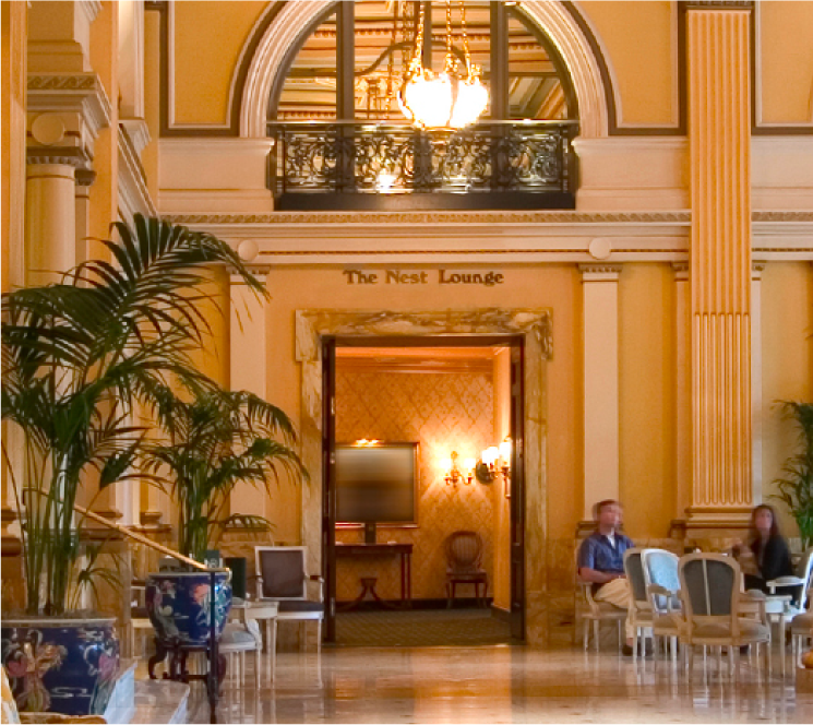 Elegant Night Photography of a Luxurious Hotel Lobby Bar Interior
